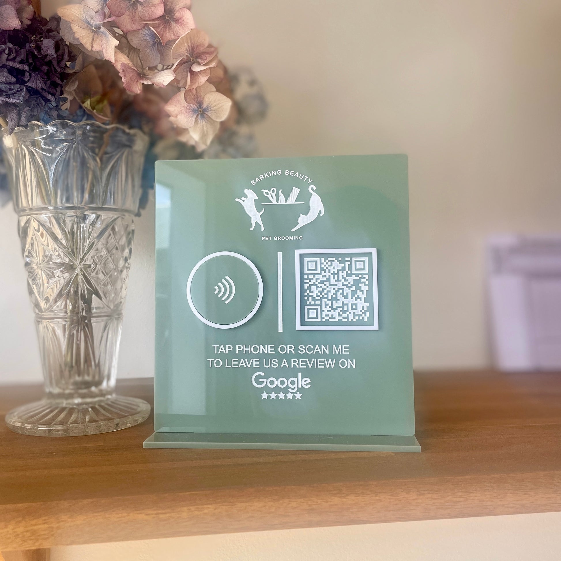 This sign allows you to link up to two urls of your choice. Customers can access your reviews page by either scanning the QR code or tapping the NFC chip.