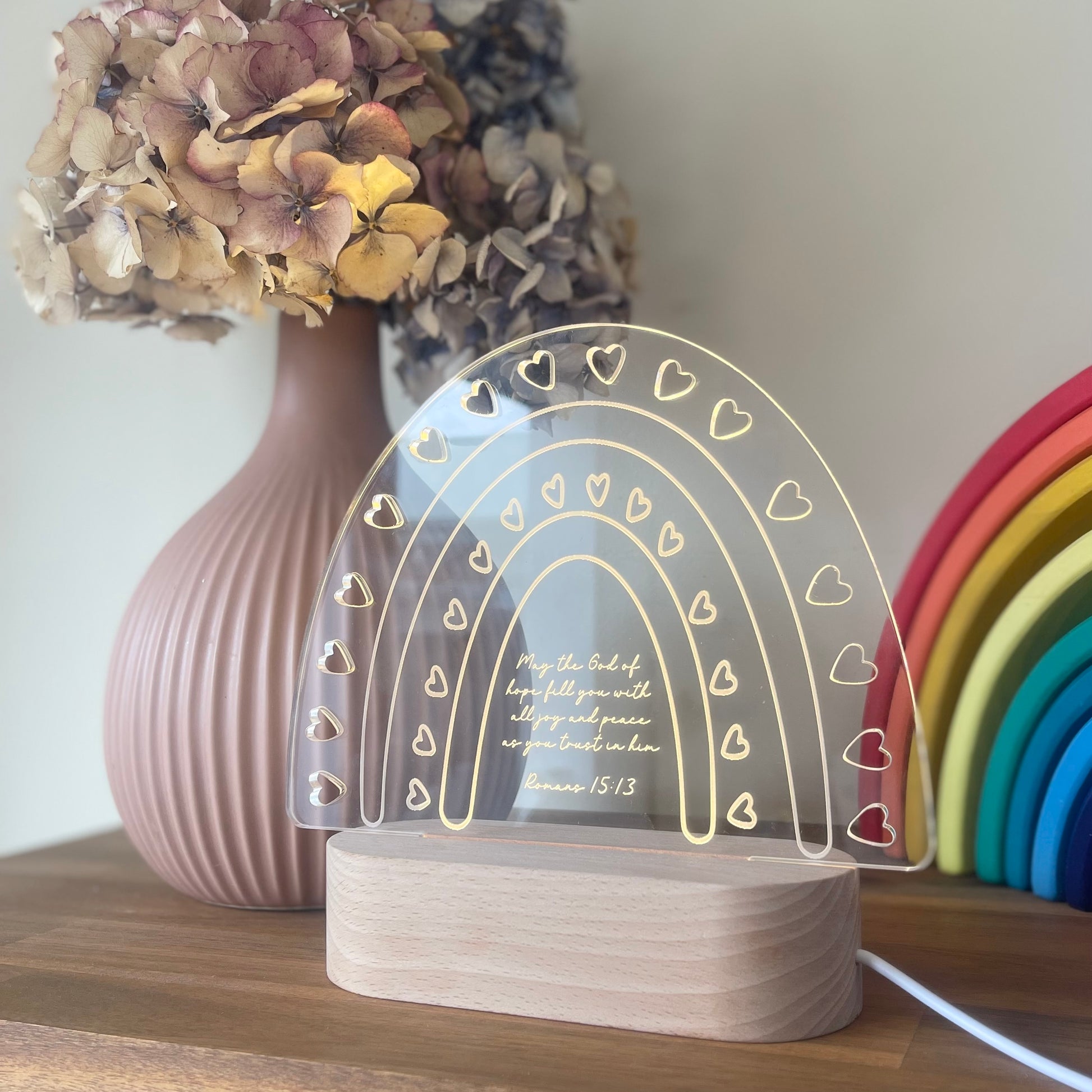 Illuminate your child's room with our Promises Night Light. With a LED light base, featuring a Rainbow, this unique night light provides comforting light for your little one's bedtime. Let them drift off to sleep remembering the promises of God over their life.
