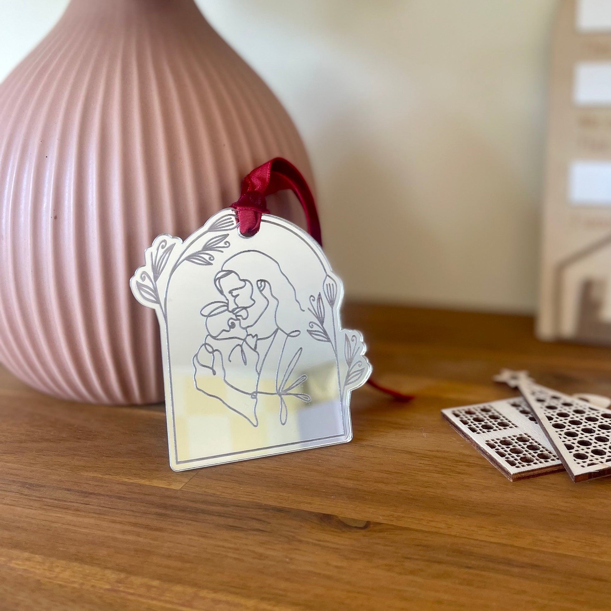 This Angel Baby Ornament holds space for remembrance and love. Featuring a delicate line art image of Jesus embracing an infant, it offers a tender way to honor a baby's memory during the holiday season and throughout the year.